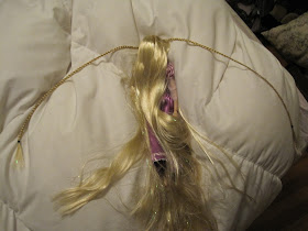 I was fiddling around with Rapunzel's hair this week.  There's so much of it, and it was shedding like mad, so I thought I'd try the movie's remedy and braid it.  I'd seen a pic on YouTube of someone's Rapunzel doll with a similar style (sorry, I don't remember the video!), and thought I'd try my own rendition.  So, without further ado, here is Rapunzel's braid: